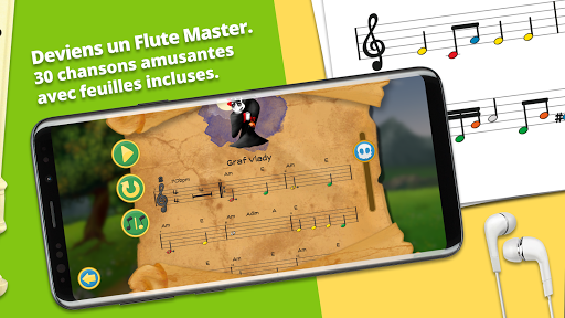 Tu trouveras de nombreuses pistes musicales uniques pour apprendre progressivement à jouer chaque note sur ta flûte à bec. À la fin du jeu, tu pourras interpréter de superbes morceaux de flûte à bec! ;)