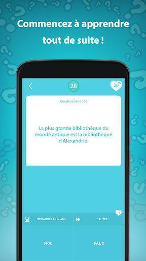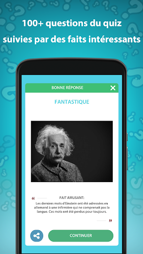 Quiz culture générale, un jeu de quiz de connaissances générales avec des réponses pour tous les apprenants et les quiz est bien plus qu'un simple test de culture générale en français. Il t’offre une chance d'explorer vraiment le monde et de le connaître de différentes manières. Une fois que tu as terminé le jeu de quiz culture générale gratuit et que tu as répondu à toutes les questions sur les connaissances générales, tu te sentiras étonné, tu en voudras plus ! Alors, télécharge les jeux de quiz culture générale MAINTENANT !