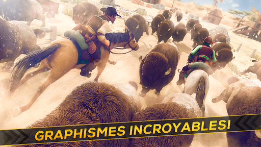 Combien pouvez-vous survivre sans fin sous les pieds du bison? Courez, esquivez et volez avec votre cheval.