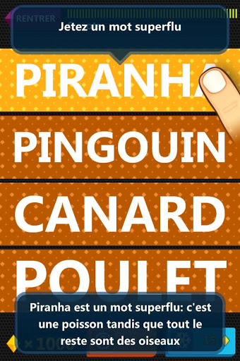 "Jeter un mot" est un jeu de mots. Le but du jeu est de jeter un mot superflu du groupe. Par exemple: "piraya", "pingouin", "canard", "poulet". “Piraya” est un mot superflu: c'est une poisson tandis que tout le reste sont des oiseaux.