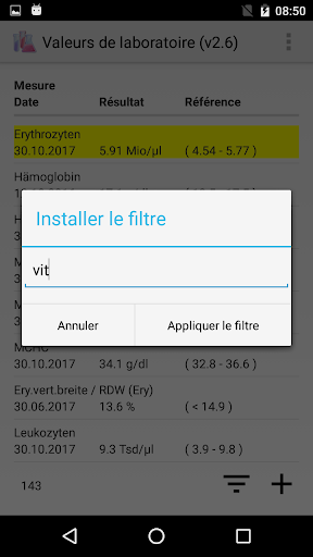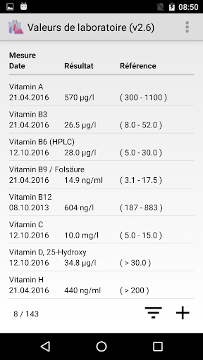 Environ 140 des valeurs de laboratoire les plus fréquemment mesurées (par exemple érythrocytes, hémoglobine, cholestérol, HbA1c, ferritine, sodium, potassium, créatinine, TSH, ...) ont déjà été inclus dans l'application. Les valeurs mesurées peuvent être modifiées et complétées. Si d'autres zones de référence sont applicables dans votre cas, elles peuvent également être modifiées.