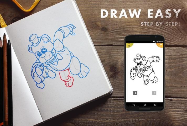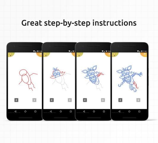 We offer you to dive into a whole new world with your smartphone and the cult Five Nights at Freddy’s game. If you want to learn something completely new and impressive - while drawing app - this is exactly what you need! Our team of artists and programmers has produced incredible tutorial that will teach you how to draw Five Nights characters, as a Chica, Banny, Bear step by step. The advantages of our application: