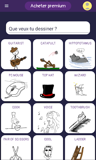 Comme le jeu du Pictionary. Acquiert des points en devinant le dessin des autres joueurs puis à ton tour de dessiner et de le faire deviner aux autres.