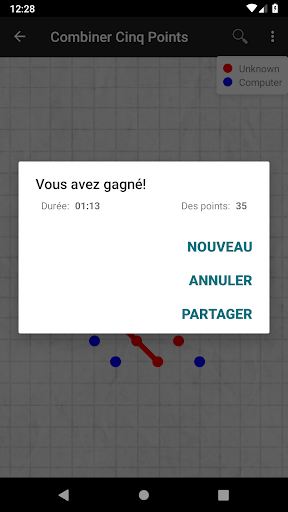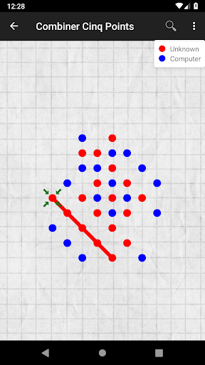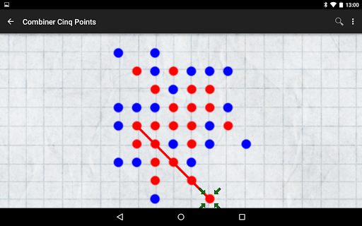 Soyez le premier à aligner cinq points, horizontalement, verticalement ou en diagonale. Android déplace les points bleus, vous, les points rouges. Les points rouges et bleus sont placés tour à tour sur les intersections. Vous jouez en premier.