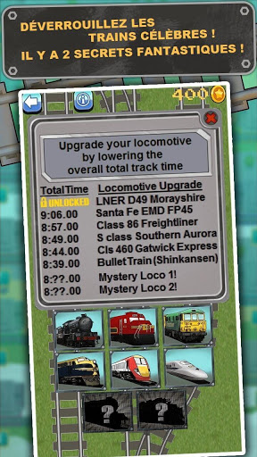 : Rejouez chacune des 8 pistes aussi vite que vous le pouvez (balayez vers le haut et le bas pour changer de vitesse) pour continuer à battre vos meilleurs temps. Vous devez réduire le temps total des 8 voies pour améliorer votre train.