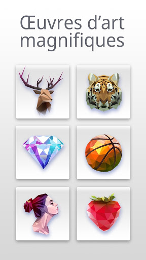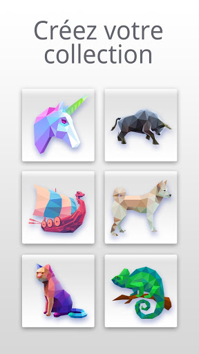 Ce casse-tête gratuit vous offre une collection de poly art très riche et variée ! Les couleurs vives et les figures d'une complexité croissante rendent les jeux de poly art très intéressants et amusants. Venez tester les caractéristiques formidables de **Polygone art : jeux de puzzle 3D**