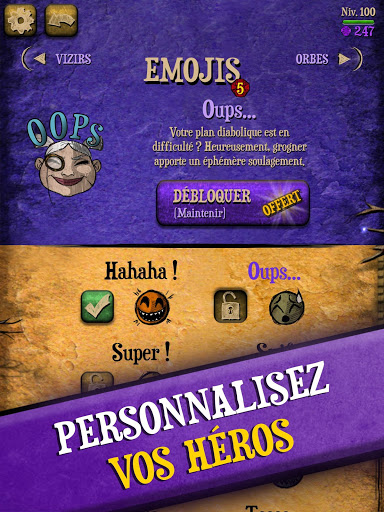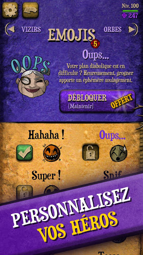 Profitez des nombreux outils de personnalisation du jeu pour vous créer un vizir à l’allure unique, dont la simple vue fera fuir vos pires ennemis ! Devenez le vizir le plus stylé de ce jeu de reflexion gratuit et déambulez au milieu des casse-têtes pour montrer votre nouveau visage à vos adversaires. Poussez la tactique jusqu’au choix des accessoires pour être un vizir aussi craint que reconnaissable à votre image.