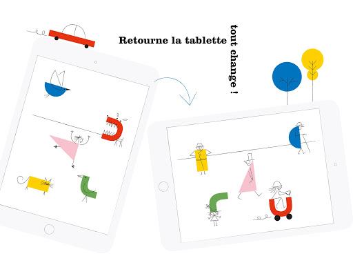 Une courte introduction nous présente les formes malicieuses qui sortent d’un chapeau et se rangent à gauche de l’écran. C’est parti ! On les déplace du bout des doigts au centre de l’écran et « ding ! » la forme prend vie et le dessin apparaît dans une animation légère. D’une tape, la forme se retourne et le losange qui était un cerf-volant devient le toit d’une maison. Une fine ligne d’horizon découpe l’écran en deux et donne un choix supplémentaire au joueur : au-dessus, les formes seront maisons, avions ou martiens. En dessous, elles seront personnages, véhicules ou petits chiens. De courts bruitages viennent accompagner l’animation sans être trop présent.