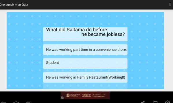 Question text and image about One punch man. Easy choice . No serious and funny parody. Some question is real answer from Author: One.