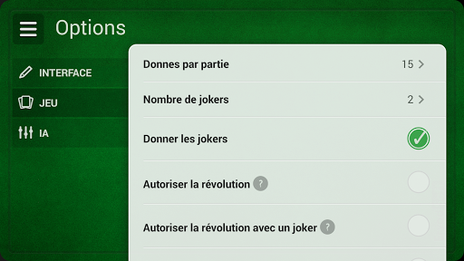 De nombreuses variantes sur les règles du Président sont incluses dans l'application :