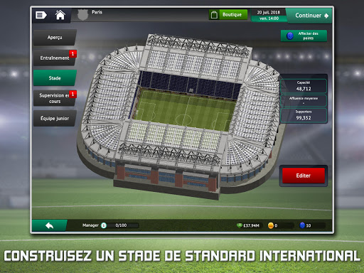 En tant que manager vous avez le contrôle sur tous les aspects de votre club de la gestion des sessions d'entraînement, au développement des locaux de votre club, en passant par les transferts, la sélection de l'équipe et la décision de son plan tactique.