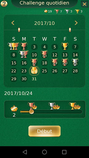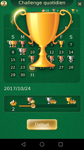 Défis quotidiens - Trois défis attendent d'être joués tous les jours. Solitaire récompense les gagnants avec des tasses en or / argent / bronze et une ou des couronne (s) supplémentaire (s). Tâche quotidienne variant de facile à difficile: un dessin de carte, un dessin de carte sans allusions, trois dessin de carte.
