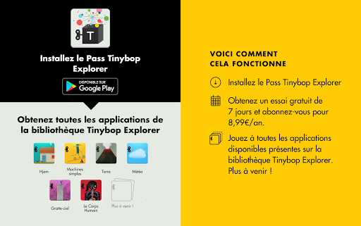 Obtenez le pass Tinybop Explorer pour lancer les applications Tinybop Explorer. Installez-le avant tout. Ensuite, inscrivez-vous pour commencer votre essai gratuit de 7 jours. Installez et jouez à 6 applications de la bibliothèque Tinybop Explorer!