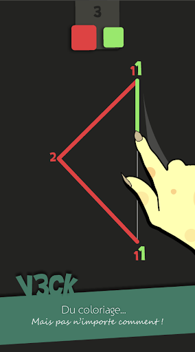 Pour gagner dans V3ck, vous devez compléter chaque casse-tête en trouvant la couleur de chacune des lignes, en vous aidant des chiffres situés sur les sommets. Les chiffres représentent le nombre de traits qui partent du sommet, ainsi que leur couleur! Il vous faudra donc déduire les solutions de chaque énigme comme vous le feriez dans le sudoku. Plus vous avancez dans V3ck, plus les puzzles seront complexes!