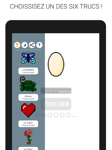 Choisissez entre 6 "Trucs" différents et utilisez vos Évolution Dots afin de les faire évoluer ! Mais seuls les plus patients parviendront à débloquer les 50 succès !