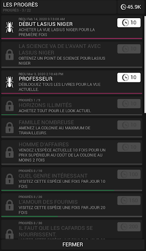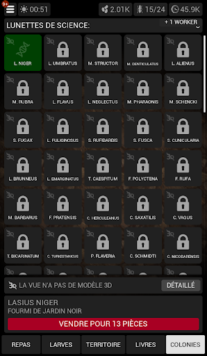 Nous étudions les fourmis et leurs habitudes. Pour de nouvelles découvertes, nous obtenons des espèces rares de fourmis à étudier. Le gouvernement a réduit notre financement, donc vous devrez acheter et vendre des colonies vous-même.