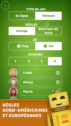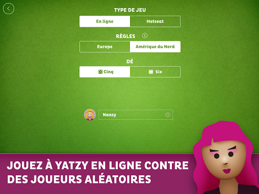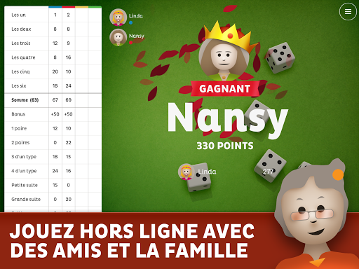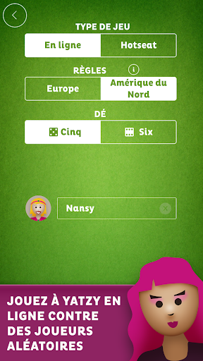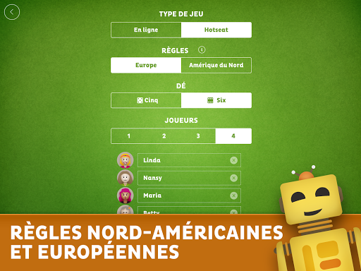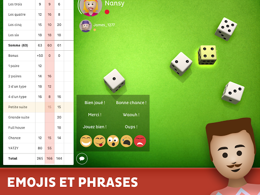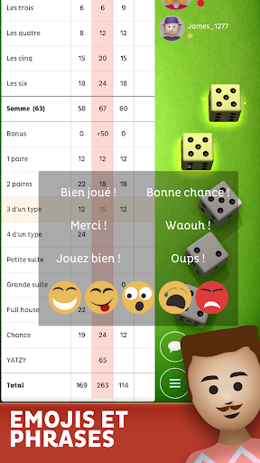 Jouez en ligne à Yatzy contre des joueurs aléatoires ou en famille et entre amis. Compatible avec les règles nord-américaines et européennes, ainsi qu'avec 5 ou 6 dés. Yatzy autorise jusqu'à 4 joueurs en ligne et hors ligne, et comprend des robots pour jouer contre l'intelligence artificielle. Jouez au jeu en ligne contre des joueurs aléatoires et montrez que vous êtes le meilleur à Yatzy ! Interagissez avec d'autres joueurs grâce à des émoticônes amusantes et des phrases pré-écrites pour ajouter de l'excitation à Yatzy !