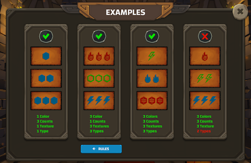 Each card will have symbols with each of these elements: Type/Count/Color/Texture. To score a match each of the four elements should either be matching or be different between each card.