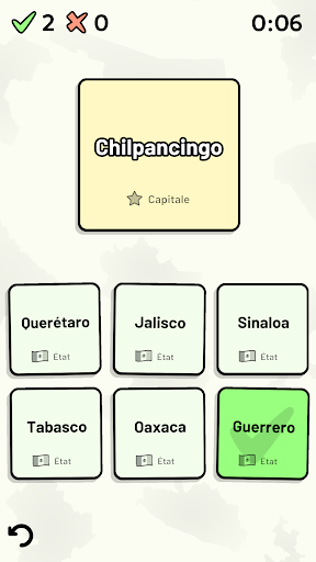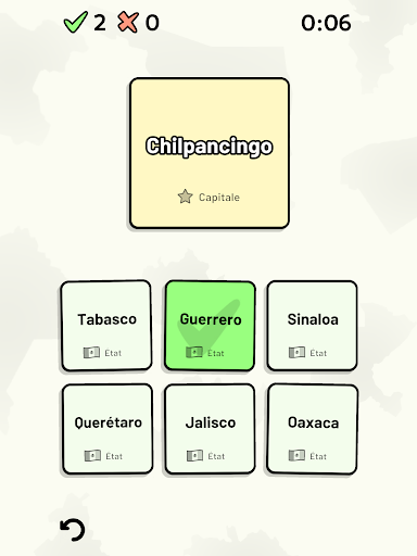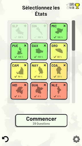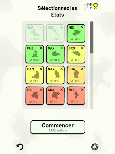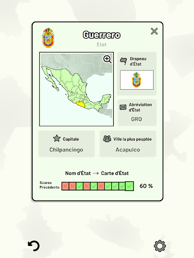 Des quiz personnalisables vous permettent de choisir les états à tester, ainsi que le sujet. Les résultats antérieurs pour chaque état sont affichés pour souligner vos progrès à chaque sujet.