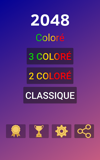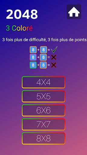 Il y a 3 options colorées, 2 options colorées et classique avec cinq niveaux de difficulté, y compris 4x4, 5x5, 6x6, 7x7 et 8x8 en 2048 coloré