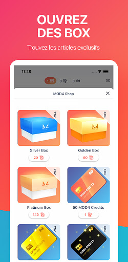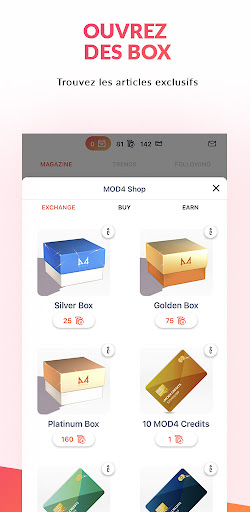 Remportez jusqu'à 4 types de Box virtuelles, l'une plus incroyable que l'autre. Trouvez les articles avec le niveau MOD le plus rare, agrandissez votre garde-robe et peut-être serez-vous assez chanceux pour trouver les plus belles pièces disponibles sur MOD4 !