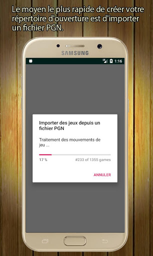 ♞ Possibilité d'importer / exporter des fichiers PGN vers / depuis votre répertoire, y compris les nags, les commentaires et les lignes de variation.