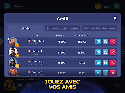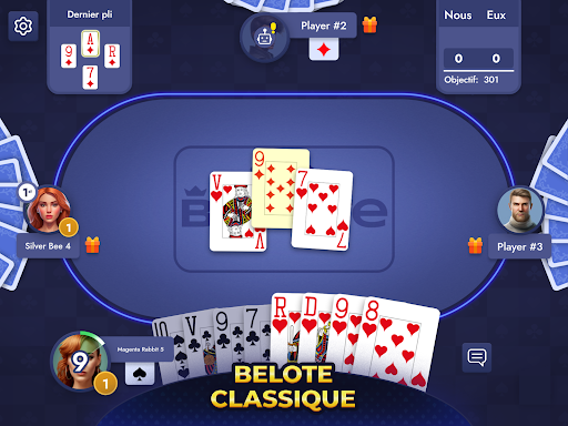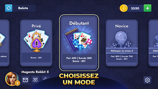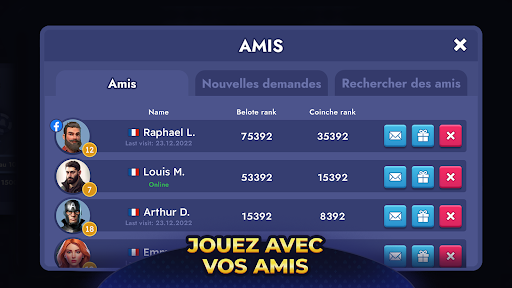 La Belote peut être jouée dans de multiples variantes et peut impliquer des paris, ce qui ajoute une couche supplémentaire de piment. En plus de jouer à la Belote ou à la Belote Coinchée, vous pouvez participer à des tournois et à des événements spéciaux. Pour plus d'amusement, vous pouvez également jouer à des mini-jeux ou coinches. Avec le jeu toujours pratiqué aux tables les plus riches, plus vous misez, plus vous gagnez ! La belote convient à tous, du débutant au joueur expérimenté, et vous procurera, à coup sûr, des heures de divertissement. Vous pouvez même jouer dans des salles privées avec vos amis et votre famille en leur communiquant le code de la salle.