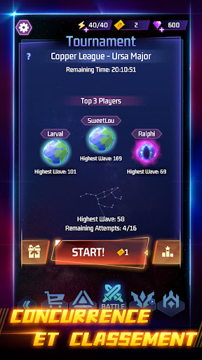 Attaquez vague après vague d'extraterrestres de l'espace, défendez la tour contre les puissants boss, mettez toutes les chances de votre côté pour survivre et remporter le succès final dans cette bataille spatiale sans fin !