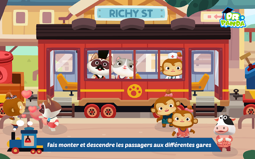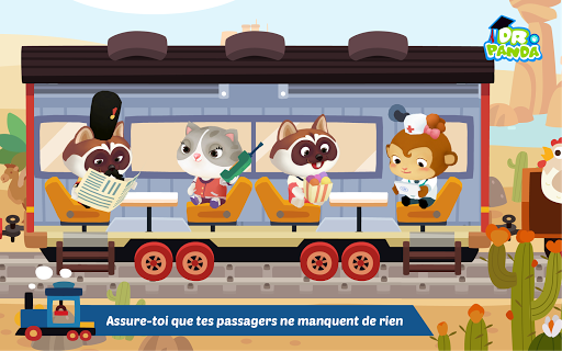 Tout le monde en voiture avec Dr. Panda Train ! Accompagne tes passagers jusqu'à leur siège, charge les marchandises et que l'aventure commence. Sorti de la gare, aide Dr. Panda à conduire le train, contrôle tes amis passager et composte leur ticket ou encore, viens leur servir un en-cas !
