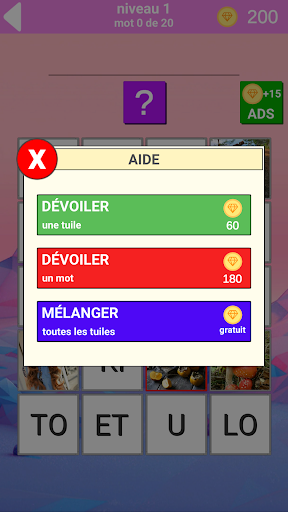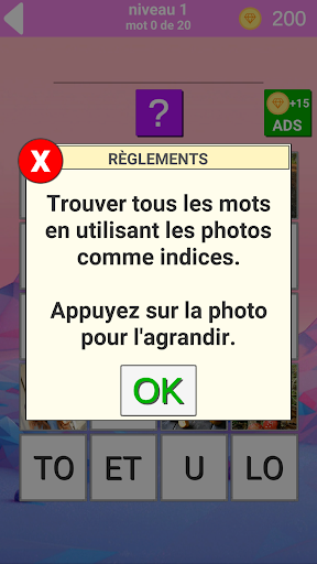 A chaque niveau, vous disposez de 20 photos avec lesquelles vous devez deviner 20 mots cachés pour passer le niveau. Les photos s'ouvrent alternativement, vous avez un certain nombre de photos disponibles, comme vous devinez qui sera disponible pour d'autres. Le jeu est disponible en 7 langues: anglais, russe, espagnol, Italien, Portugais, allemand, français.