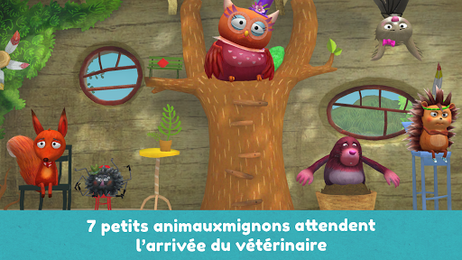 Dans le cabinet du vétérinaire, situé dans une cabane magique, les animaux attendent d’être soignés. Les enfants sont guidés tout en s’amusant pour appliquer des soins qu’ils ont auront peut-être déjà reçus eux-mêmes : prendre sa température, prendre un médicament, mettre un plâtre. Par contre, manger un escargot, il n’y a que la chouette pour trouver ça bon !