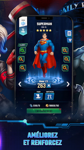 Renforcez vos personnages et collaborez avec d'autres équipes de l'univers DC. Travaillez de concert pour combattre les ennemis ainsi que l'injustice, et remportez des récompenses exceptionnelles lors d'événements à durée limitée. Vous pouvez améliorer tous vos super-héros et super-méchants DC Comics, notamment Batman, Superman, Blue Beetle, Wonder Woman, le Joker, Aquaman et Flash.