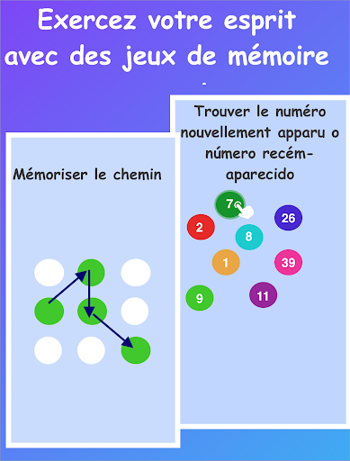 Améliorez vos capacités de mémoire avec de nombreux jeux d'entraînement cérébral et choisissez parmi plusieurs catégories telles que la précision, l'attention, la mémoire et la résolution de problèmes.