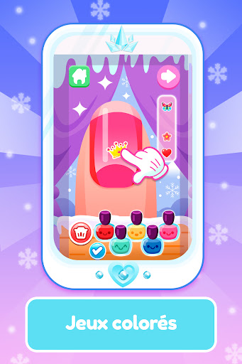 Créez des manucures super mignonnes! Explorez votre créativité, choisissez parmi différentes couleurs de vernis à ongles et autocollants. Maquillez des princesses et amusez-vous.