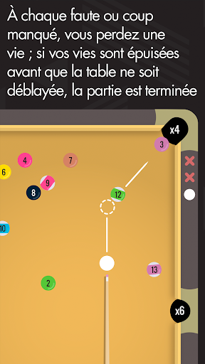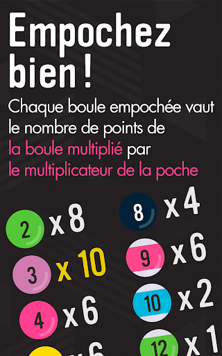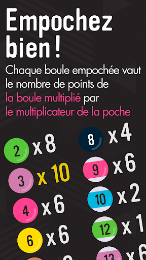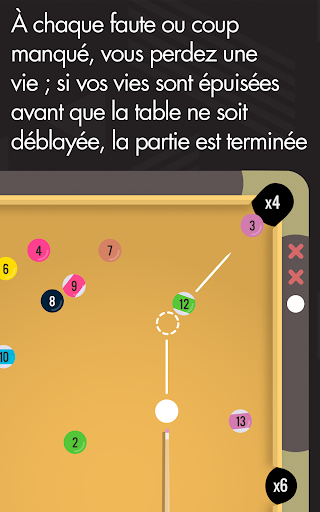 À chaque boule empochée, vous gagnez des points selon la poche où vous l'avez empochée. Alors empochez avec soin, mais attention, à chaque faute ou coup manqué vous perdez une vie, et si vos vies sont épuisées avant que la table ne soit déblayée, la partie est terminée.