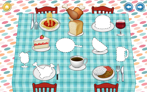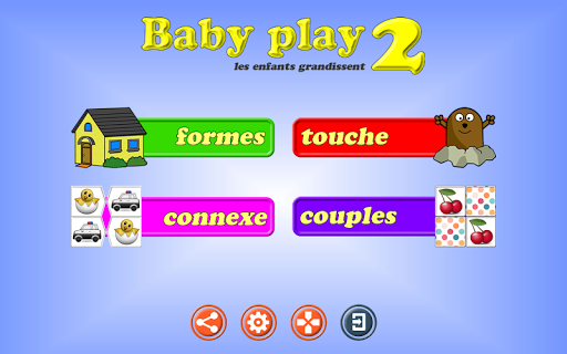 - Couples: plusieurs cartes avec des thèmes différents dans lesquels ils doivent découvrir tous les couples qui sont sous les boîtes. Les sujets sont les fruits, les animaux, les véhicules, les sports, des vêtements, de la nourriture, des drapeaux et des plantes.
