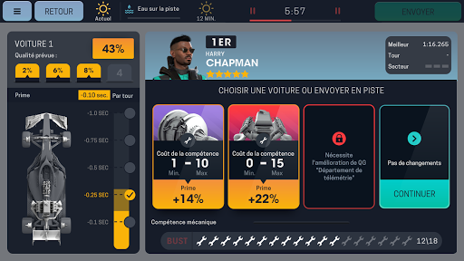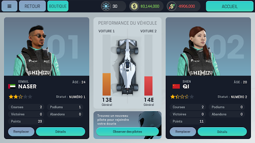 • Voici votre écurie. Louez des pilotes, améliorez votre véhicule et investissez dans la technologie.
