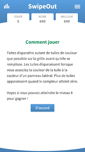 L’objectif est de faire disparaître autant de tuiles de couleur que possible de la grille. Les tuiles de couleur ne peuvent être effacées qu’en les associant à leurs panneaux latéraux de la même couleur. Plus de tuiles apparaissent quand le compteur atteint zéro, alors soyez attentif et stratégique avec vos coups. Chaque fois que vous faites disparaître une tuile de la grille, vos points augmentent. Plus votre score est élevé, plus le jeu devient difficile ! Affûtez votre stratégie et jouez le plus longtemps possible pour augmenter et maximiser votre score. Voyez si vous pouvez atteindre le niveau 8 pour gagner !