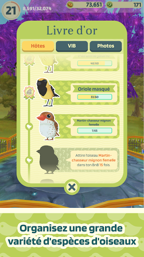 As-tu déjà rêvé d'abandonner le train-train quotidien, et peut-être même d'avoir ton propre Bed and Breakfast ? Lance-toi dans la conception de ton BnB et prends soin d'hôtes originaux pour qu'ils te laissent une évaluation de 5 étoiles ! Plus ta note est élevée, plus tu déverrouilles de chambres et attires de clients ! Collectionne leurs photos dans ton livre d'or ! Oh, et avons-nous mentionné que tes clients sont des oiseaux ? Et que tu peux passer en RA (réalité augmentée) et voir tes amis à plumes apparaître chez toi ?