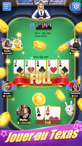 Le JOJO Poker - texas scopa est un jeu de divertissement pour adultes seulement. Réussir dans ce jeu ne signifie pas que vous serez récompensé avec de l'argent réel, ni que vous réussirez dans le jeu d'argent réel.