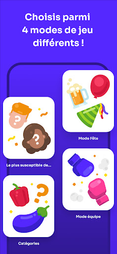 - Plusieurs modes de jeu : choisis parmi les modes de jeu « Mode soirée », « Mode équipe », « Le plus susceptible… » ou « Catégories » pour varier les plaisirs.