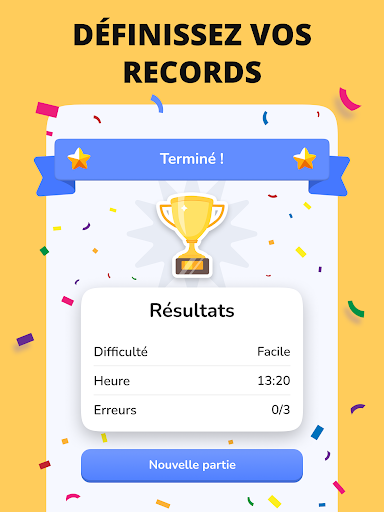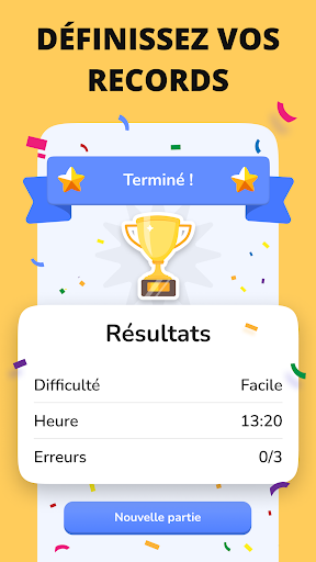 Utilisez les indices si vous avez besoin d'aide et devenez un véritable solutionneur de grilles de sudoku. Définissez de nouveaux records, défiez des amis, comparez les durées de jeu et nombre d'erreurs. Devenez le meilleur !