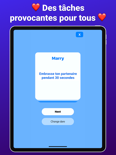 Le meilleur jeu pour les couples avec des tâches sélectionnées et des questions intimes. Ayez votre rendez-vous parfait, votre soirée parfaite ou votre moment parfait avec votre partenaire.
