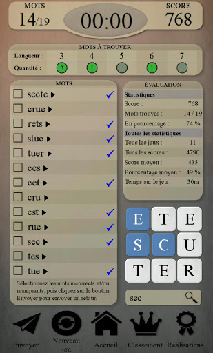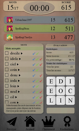 - Écran d'évaluation : statistiques, mots disponibles et des animations pour les trouver, lien rapide vers les entrées du dictionnaire des mots inconnus