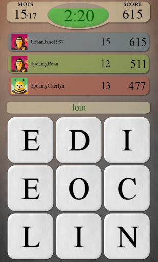 - Indice : une bulle apparaît toutes les 20 secondes. Si vous la touchez, les deux premières lettres d'un mot (pas encore trouvé) sont révélées (bleu clair - première lettre, bleu foncé - seconde lettre)
