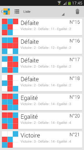 Ce jeu permet de suivre l'évolution de vos parties à l'aide des succès et d'un classement (via Play Games) ou de consulter l'historique de vos parties dans une interface aux couleurs de Holo Light ou Holo Dark.