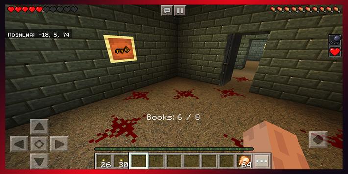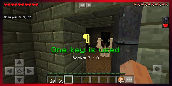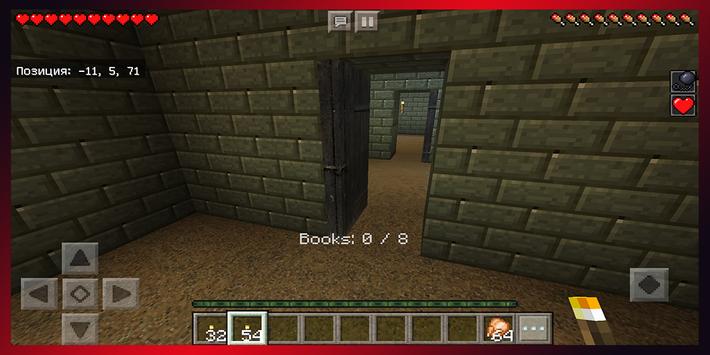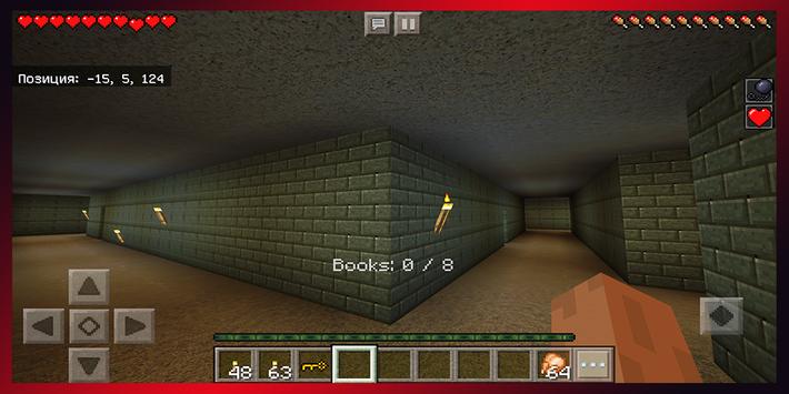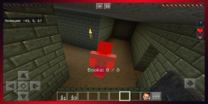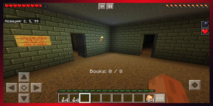 It's not as simple as it might seem at first glance! In addition, that you need to find and collect all 8 books, you will have to find the keys to some rooms. You will have only a few torches, which you can light your way in the pitch darkness of the terrible corridors of the cellar of this horror map for Minecraft.