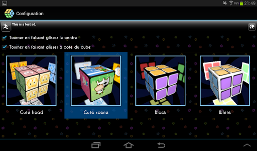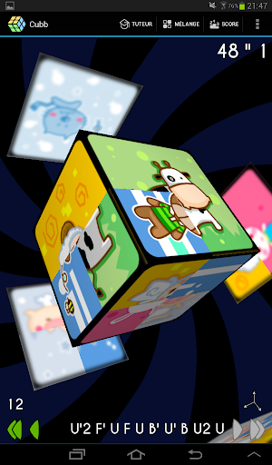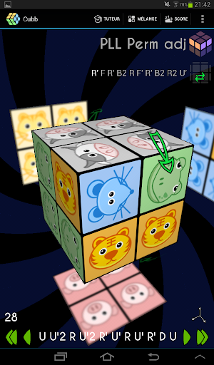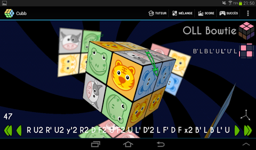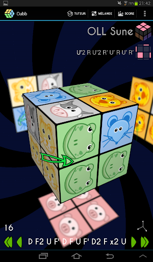 Après la première face, il faut retourner le cube en utilisant soit un glissé central, ou par un demi-tours des deux tranches. Je suppose que c'est à ce moment que vous bloquez (La flèche indiquant le prochain mouvement est au milieu, mais ça n'a rien d'évident). Appuyer sur la flèche verte en bas à droite fonctionne aussi.