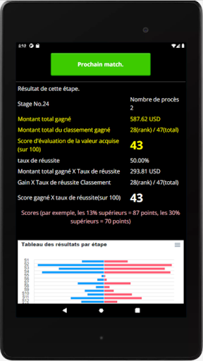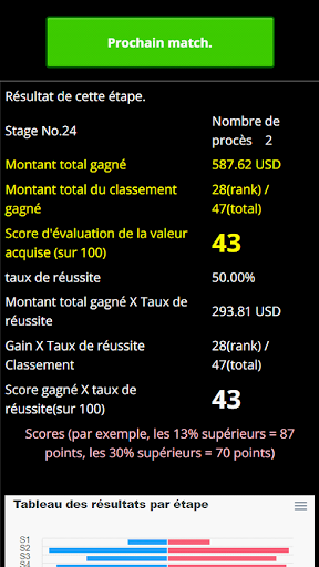 Le jeu affiche la valeur de l'écart pour chaque transaction, ce qui vous permet de vérifier votre progression à chaque transaction. Le classement de l'étape est calculé en deux catégories : classement en valeur absolue et valeur absolue/nombre de tentatives nécessaires pour passer l'étape, et est évalué sur une échelle de 100 points. (88 points pour les 12% supérieurs).