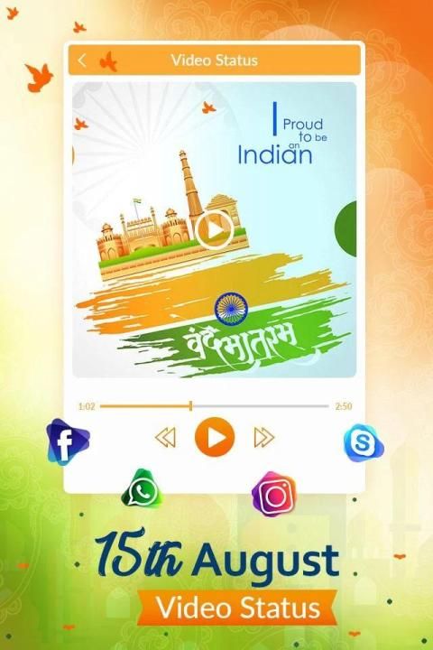 स्वतंत्रता दिवस उस दिन का सम्मान करता है, जिस दिन भारतीय लोग स्वतंत्र थे। 15 अगस्त, स्वतंत्रता दिवस स्थिति ऐप आपके सहयोगियों के साथ अद्भुत वीडियो साझा करने के लिए स्वतंत्र है जो आपकी राष्ट्रीय भावनाओं को दिखाते हैं।